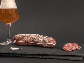 Salame crudo insaporito con spezie ed erbe aromatiche e legato a mano in budello naturale. L’impasto è arricchito con birra artigianale senza glutine, che sostituisce il vino rosso e dona al prodotto un gusto originale.