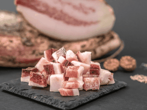 Il guanciale stagionato è ricavato dalla guancia e da parte del collo del maiale, viene strofinato con sale, insaporito con pepe, aglio e rosmarino e lasciato stagionare per almeno cinque mesi. Viene lavorato intero, affettato e tagliato in pratici dadini, pronti all’uso.